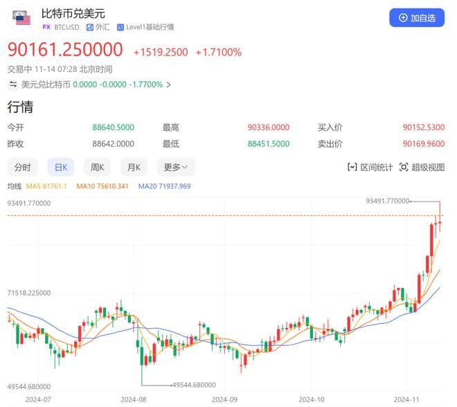 CPI数据公布后,比特币上破90000美元,且在5分钟再破91000美元整数关口,一度上探93491.77美元,再创历史新高。