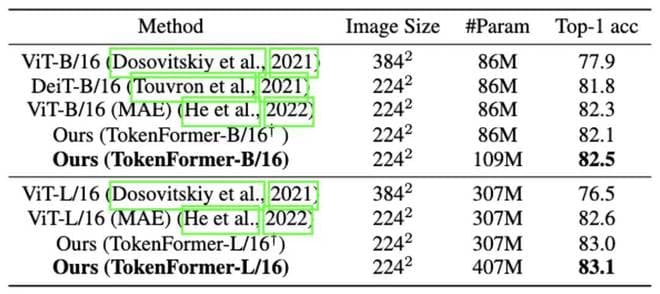在 ImageNet-1K 的监督训练的 setting 上,使用相同的训练策略, TokenFormer 的性能超过了 vision-transformer,验证了其在 visual modeling 上的能力。