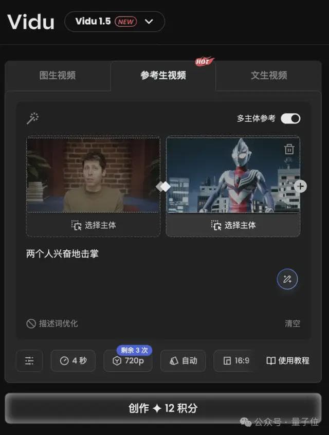 这个功能上周六Vidu就在X上偷偷预热了,昨天正式上线。简单讲,这个功能支持上传1~3张参照,来实现对多主体的控制。