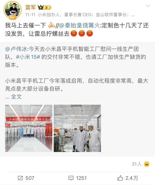 没想到在互联网高强度冲浪的雷军转发了该评论并回复道:马上去催一下。