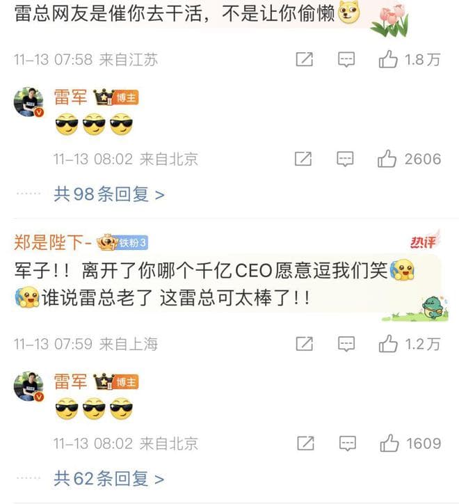 评论区网友也是纷纷调侃:"雷总啊,五十多岁正是打拼的年纪,怎么还咪上了呢。"