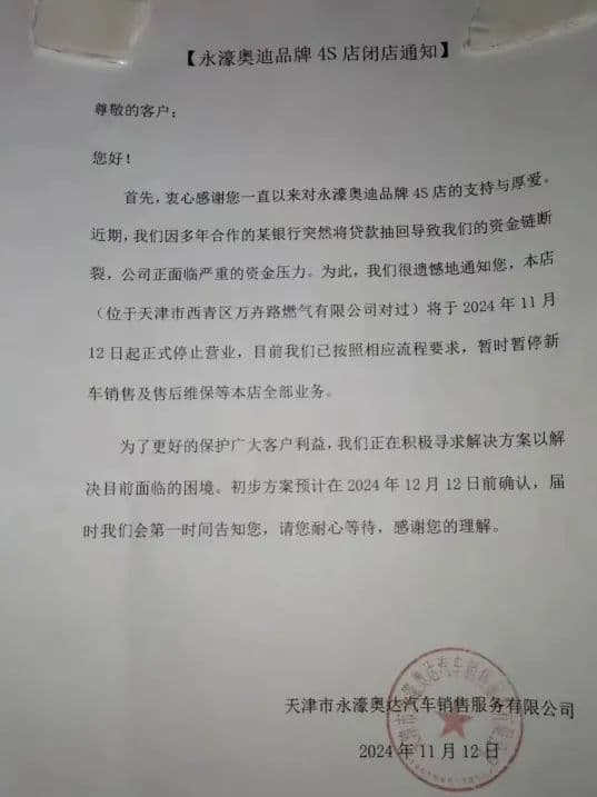 天津最大奥迪4S店被传闭店跑路,已拖欠员工三个月工资,上千车主受影响,损失总额已超亿元
