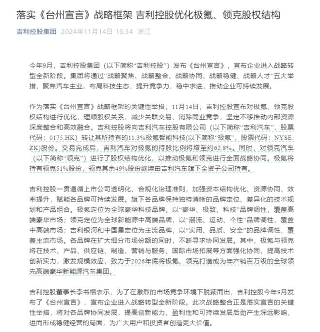 11月14日,吉利控股官方宣布对极氪、领克股权结构进行优化,将向吉利汽车控股有限公司转让其所持有的 11.3% 极氪智能科技股份。交易完成后,吉利汽车对极氪的持股比例将增至约 62.8%。继吉利控股宣布对极氪、领克股权结构进行优化后,领克汽车和极氪汽车官方在微博互动,官宣“在一起”。同日,沃尔沃汽车也宣布,以人民币 54 亿元的对价出售其在领克公司 30% 的股权予极氪。