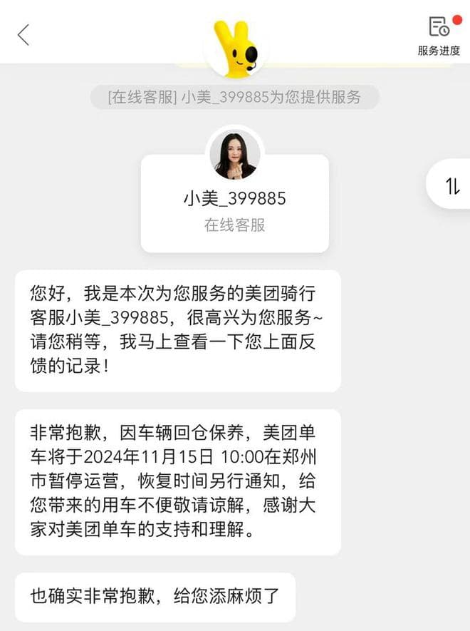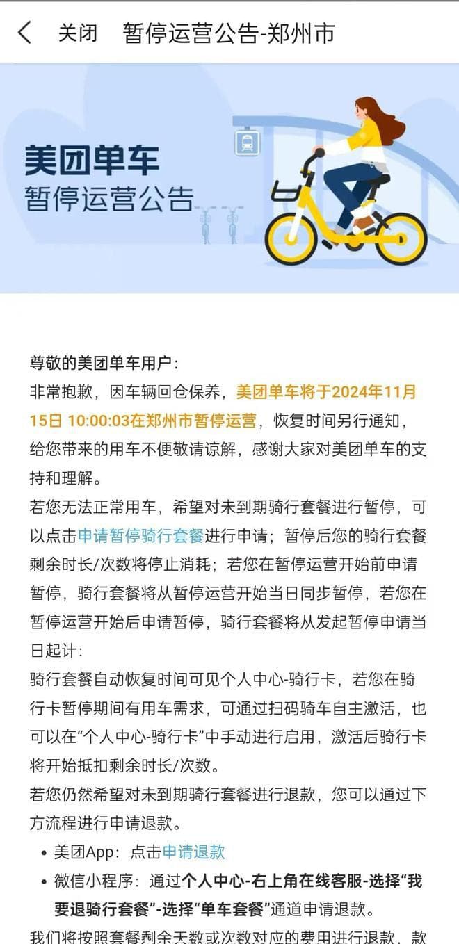 而美团单车声明称,因车辆回仓保养,美团单车将于11月15日10时在郑州市暂停运营,恢复时间另行通知。同时,美团单车提供暂停骑行套餐以及退款相关服务。