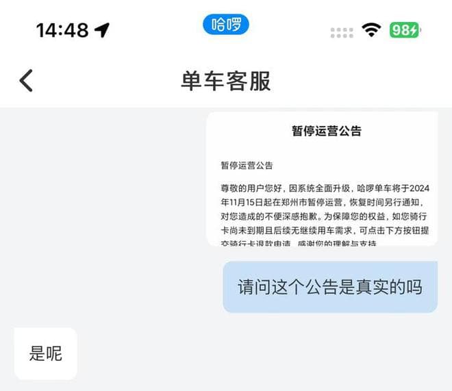另据界面新闻报道,美团单车及哈啰单车的客服均确认上述公告属实。