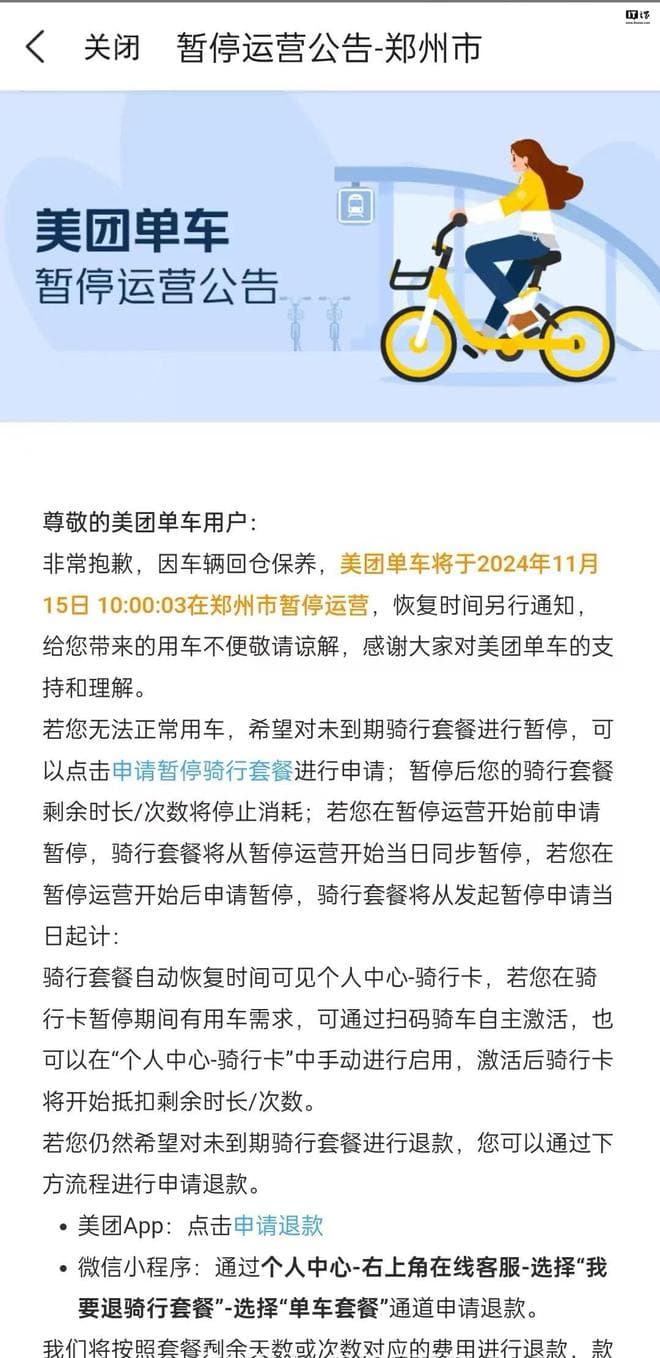 美团、哈啰单车被曝今起在郑州市暂停运营,客服确认属实
