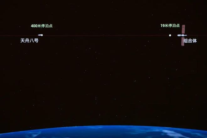11月16日在北京航天飞行控制中心拍摄的天舟八号货运飞船与空间站组合体完成交会对接的画面。