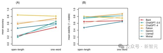 其次,尽管所有LLM在稳定性方面表现高于随机水平,但没有一个能够始终如一地对同一个问题给出相同的答案。