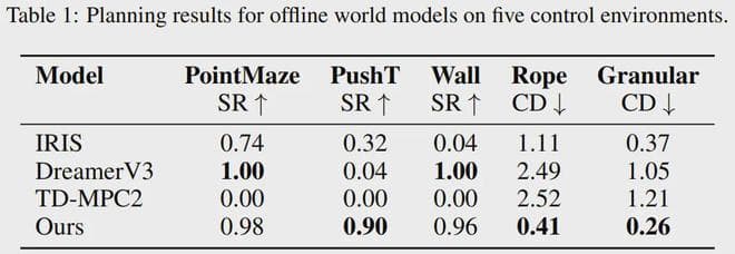 如表 1 所示,在 Wall 和 PointMaze 等较简单的环境中,DINO-WM 与 DreamerV3 等最先进的世界模型相当。但是,在需要准确推断丰富的接触信息和物体动态才能完成任务的操纵环境中,DINO-WM 的表现明显优于之前的方法。