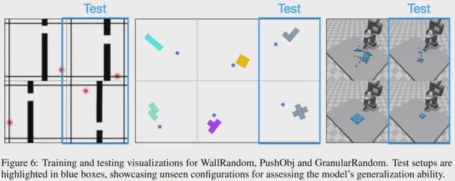 该团队也评估了新提出的模型对不同环境的泛化能力。为此,他们构建了三类环境:WallRandom、PushObj 和 GranularRandom。实验中,世界模型会被部署在从未见过的环境中去实现从未见过的任务。图 6 展示了一些示例。