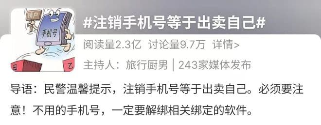 而就在广州伍女士的惨痛经历发生前几个月,安徽铜陵市民警 “ 徐督督 ” 在平台上发布 “ 注销手机号等于出卖自己 ” 的警示视频,迅速登上热搜第一,迄今为止已经有 2.3 亿的阅读量。