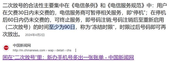当前,关于运营商会把手机号空置时间多久才 “ 二次放号 ” 这个问题,网上的说法各不相同,有说一两年的、还有说几个月的,而能找到的比较权威的说法是,手机号注销后,会有90 天冻结期,冻结期过后就有可能被重新投入市场。