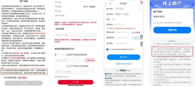 哦对了,托尼在各大运营商销户界面里也发现了一个问题,销户时除了必要信息的填写, “ 解绑常用软件 ” 的提示要么就小得一 nienie 要拿放大镜看,要么干脆就直接没有。