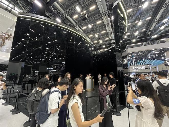 不过,尊界首款车尽管参展了,但并未公开亮相。蓝鲸新闻在现场看到,鸿蒙智行展台上"四界"首次同台,但尊界的展示区域被高高的黑色玻璃围了起来,入口处设有隔离带,并安排了工作人员把守,透着神秘感。