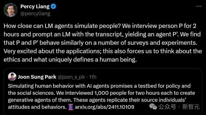 【新智元导读】AI智能体,已经无限逼近真实人类?1000个人被采访,每人两小时,真实人类的智能体就这么水灵灵地被投放进去了,结果更是令人吃惊:在模拟人类行为上,智能体已经85%逼近真实人类。AI,终究是预判了你的预判。