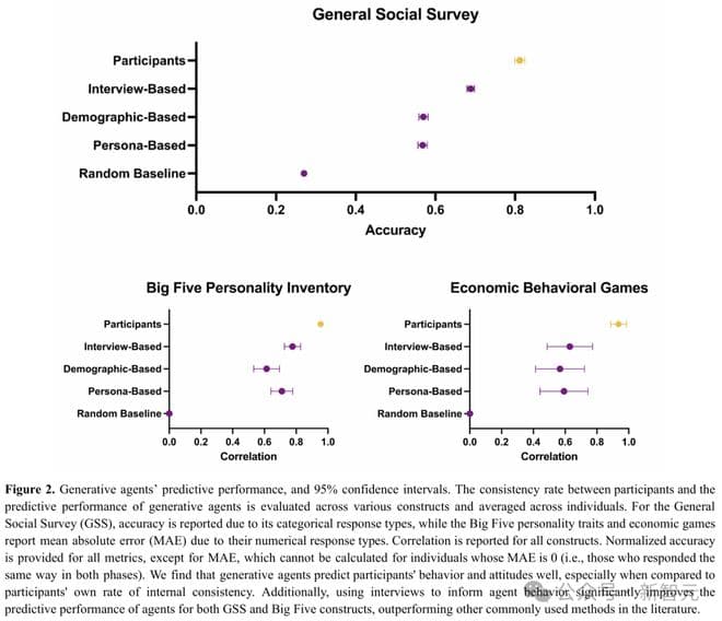 他们创建了反映真实个体的生成式智能体,并通过衡量它们在多大程度上能够重现个体对综合社会调查、大五人格测试、经济博弈以及随机对照试验的反应,来验证这些模型的有效性。
