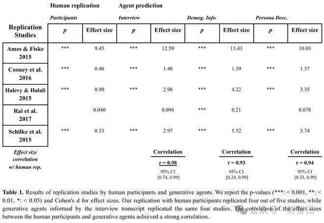 最新研究中,人类参与者和生成式智能体都完成了全部五项研究,并使用与原始研究相同的统计方法计算了p值和处理效应量。