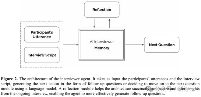 为了赋予AI访谈员这种能力,研究者特意设计了一种访谈架构,让研究者能控制访谈的整体内容和结构,同时允许智能体有一定的自由度,来探索采访脚本中硬编码的后续问题。