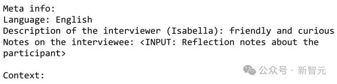 然后,在提示语言模型生成访谈员的行动时,研究者也没有使用完整的访谈记录,而是用了访谈员积累的简洁但描述性强的反思笔记,以及最近5,000字符的访谈记录。