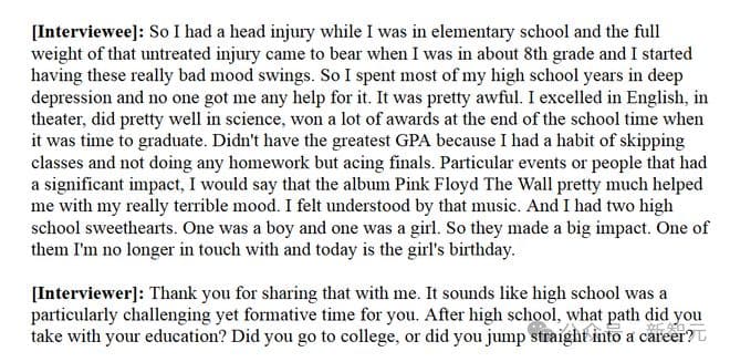 听完被试的高中经历后,ta会贴心地进行总结,然后继续提问:「谢谢你与我分享这些。听起来高中对你来说是一个特别有挑战性、但成长很多的时期。高中毕业后,你选择了怎样的道路?是去上了大学还是直接进入职场了呢?」