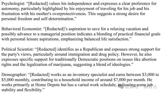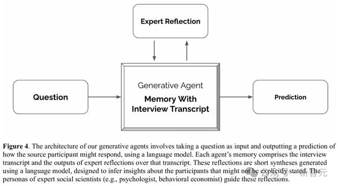 每个智能体的记忆包括采访记录和专家对该记录的反思的输出。这些思考是使用语言模型生成的简短综合,用于推断可能未明确说明的参与者的见解。专家社会科学家(例如心理学家、行为经济学家)的角色,则会引导这些反思