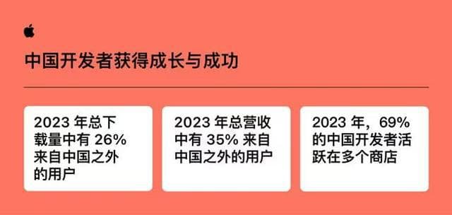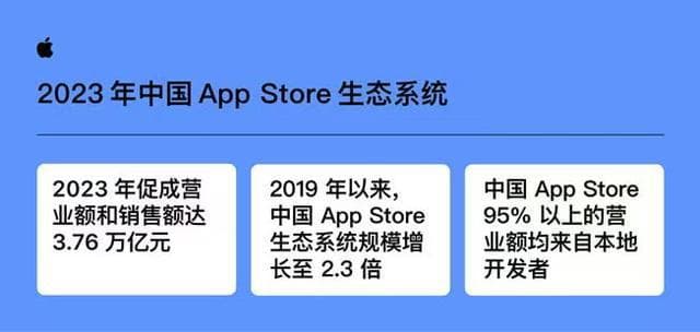 数据显示,中国开发者的收入自 2018 年以来翻了近一番。2023 年,App Store 生态系统在中国促成的开发者营业额和销售额 为3.76 万亿元。中国 App Store 近 90% 的下载量和 95% 以上的开发者营业额均来自中国开发者创作的 app。据 Apple 公布,中国 App Store 每周访客量达 1.5 亿。
