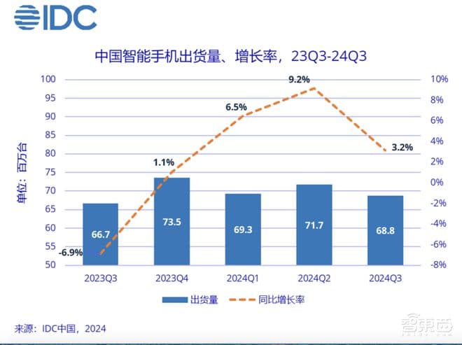 国际数据公司(IDC)最新手机季度跟踪报告显示,2024年第三季度,中国智能手机市场出货量约6878万台,同比增长3.2%,连续四个季度保持同比增长。新一轮换机周期的到来使得市场需求持续向好。vivo、华为和小米等厂商市场表现亮眼,推动了安卓市场同比增长3.8%。苹果新品上市首销以后,市场需求并无明显改变,iOS市场出货量同比下降0.3%。