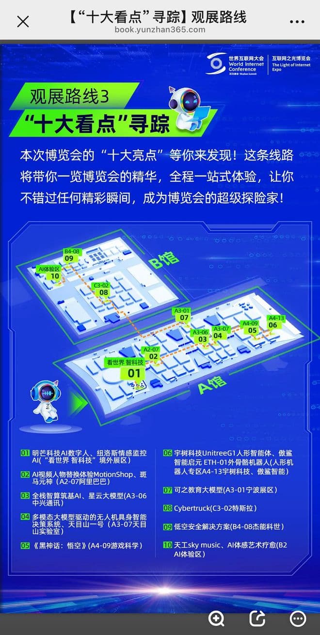 为提升观众观展的趣味性和体验感,今年的博览会特别推出“十大看点”,从算法模型、数据算力、场景应用等全链条展示人工智能最新技术、最新产品、最新成果,同时展示低空经济、智能网联汽车、人形机器人、数字文创等跨界融合热点,设置“看世界 智科技”“新灵感 新势力 新动能”等特色展区,并首次推出五条特色观展路线,分别为数智产业洞察、科技探秘之旅、“十大看点”寻踪、AI智趣漫游、未来生活体验,还为观展团队配备了专业讲解员。此外,本届博览会还布设了50余项智慧化互动体验项目,场景化打造“AI创艺之境”体验区、人形机器人专区,让人工智能可感、可触、可及。