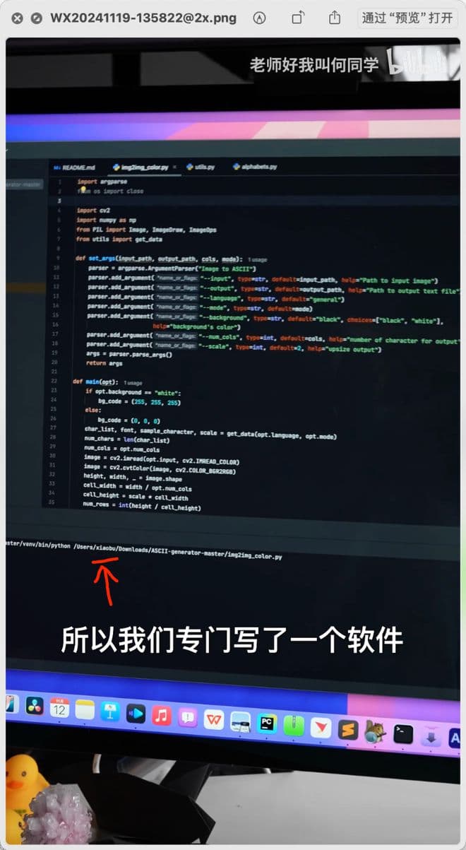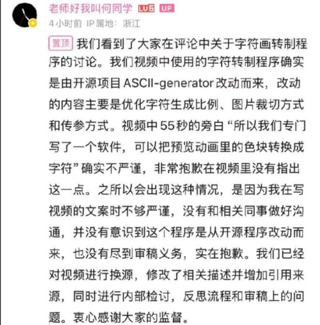 在介绍核心功能(字符画转制程序)时,何同学在视频中声称:“所以我们专门写了一个软件,可以把预览动画里面的色块转换成字符,提高效率。”但据网友“epcdiy”介绍,这款“专门写的软件”实际是GitHub上的开源项目“ASCII generator”,该项目可用于生成ASCII码,支持图像转文本、图像转图像、视频转视频。何同学不仅隐瞒了来源,还删除了原作者的信息,这一举动引起了网友的诸多吐槽。