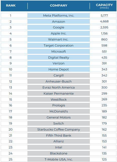Meta 以近 5.2 吉瓦(GW)的太阳能装机容量荣登美国企业太阳能用户榜首;谷歌则在电池储能方面拔得头筹,拥有 936 兆瓦时(MWh)的装机容量。IT之家附上相关图片如下:
