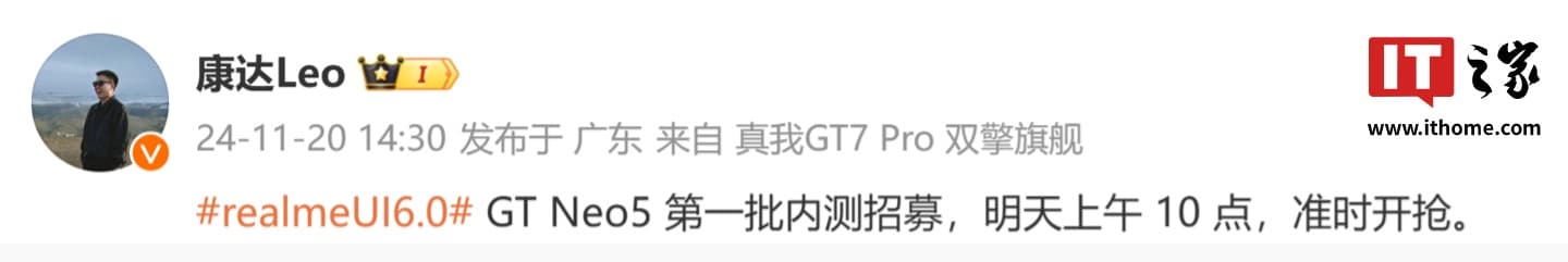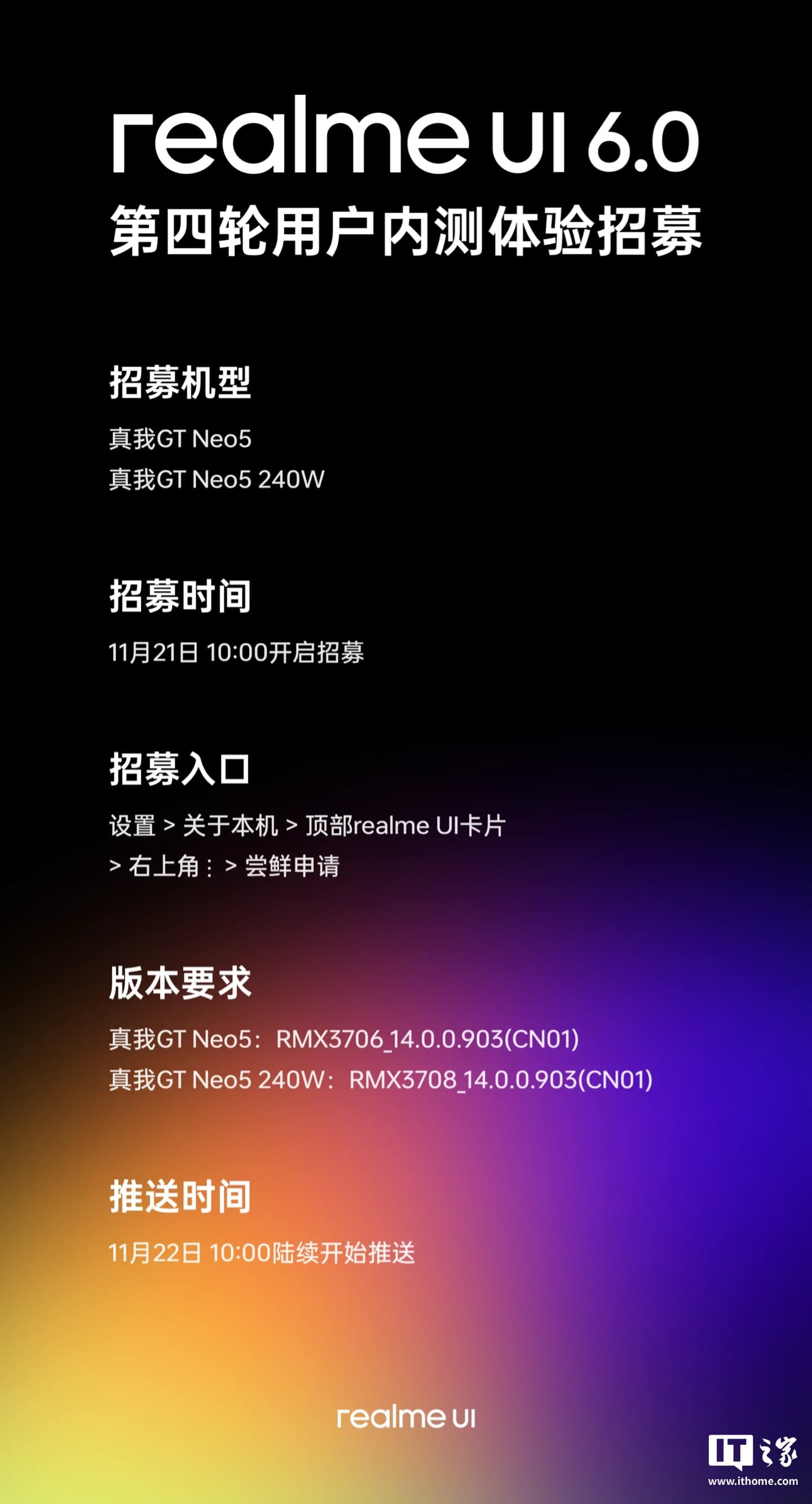 IT之家 11 月 20 日消息,realme UI 官方今日宣布,realme UI 6.0 第四轮内测用户招募将于 11 月 21 日正式开启,选定真我 GT Neo5、真我 GT Neo5 240W 作为第四轮招募机型。