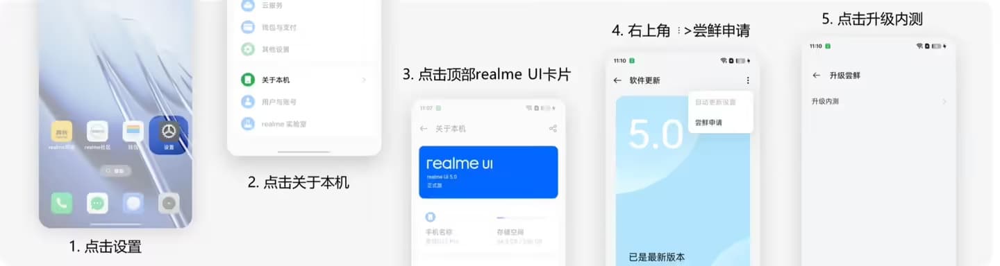 设置 > 关于本机 > 顶部 realme UI 卡片 > 右上角 ⋮ > 尝鲜申请