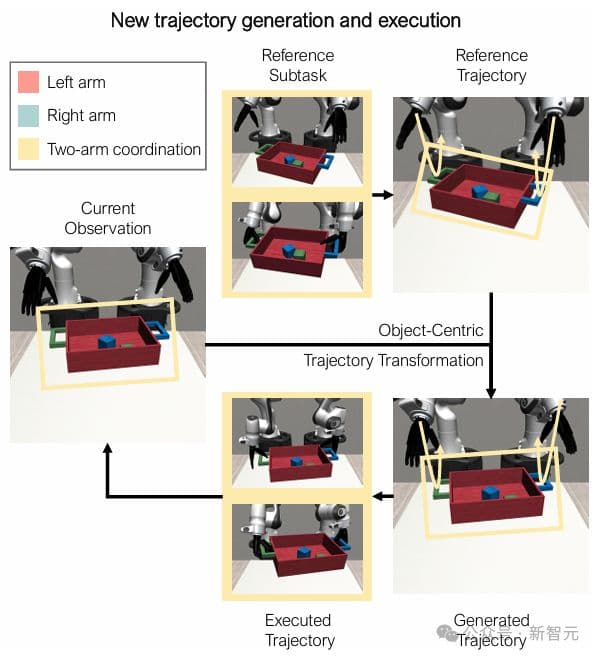 在数据生成开始时,场景会被随机化,并选择一个源演示。随后,为每只手臂的各个子任务并行地迭代生成和执行轨迹。