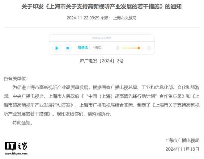 IT之家 11 月 22 日消息,上海市广播电视局今日印发《上海市关于支持高新视听产业发展的若干措施》。