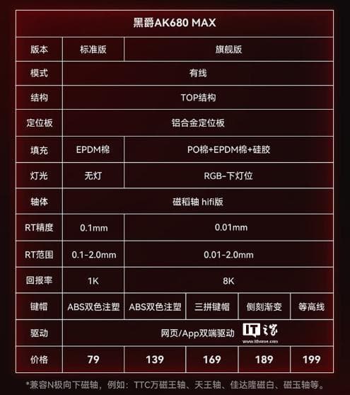 据介绍,黑爵AK680 MAX 磁轴键盘拥有标准版和旗舰版两款,均采用有线连接方式,延迟约 0.125ms。其中 AK680 MAX 标准版回报率为 1000Hz、Pro 版回报率为 8000Hz。
