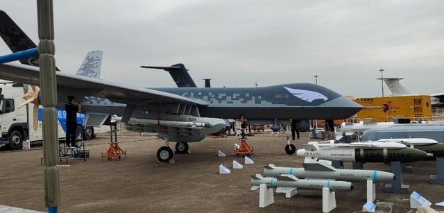 而在九天无人机旁边的翼龙WL-X无人机也同样耐人寻味,翼下挂载的大型声呐浮标吊舱,轻型反舰导弹,短距格斗空空导弹等,显示这是一架海上反潜巡逻型大型无人机。据介绍,该机续航时间达40小时,航程达10000公里,从这一点来说,比有人反潜巡逻机要更强,如果同时多架执行任务,那可以控制非常大的海域,和其他海军战机,战舰、潜艇、无人潜航器相配合,作战效能非常高。