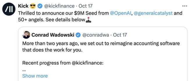 上月,一家名叫Kick的硅谷AI记账自动化公司宣布完成900万美元种子轮融资。尽管AI/FinTech领域一直是热门吸金板块,但Kick因其特殊的融资背景格外引人注目,因为它是OpenAI Startup Fund最早期的投资组合之一。