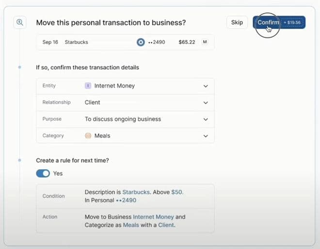系统识别出个人账户中有一笔因公的星巴克花费,创建和移至相应分类,并自动拟定“星巴克50美元以上”分类标准。