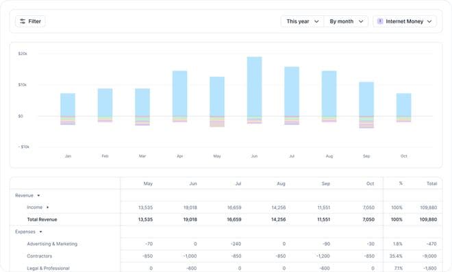 实时收支洞察:创建自定义收支项目,帮助用户每月清晰了解收入来源,实时洞察盈利驱动因素。