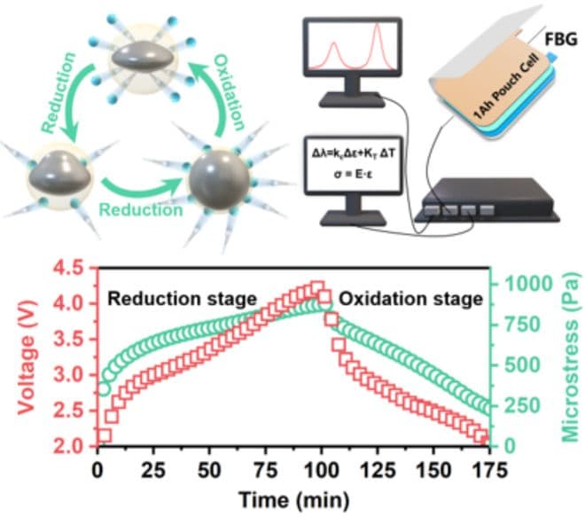 基于此,他们受到建筑学中建筑结构健康监测技术的启发,于是向钠离子软包电池中原位置入光纤布拉格光栅微型传感器,探索在充放电过程中微应力变化与 Na+ 输运之间的构效关系: