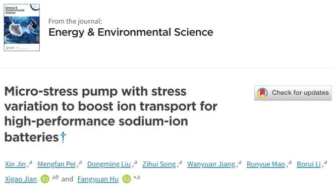 1.Jin, X., Pei, M., Liu, D., Song, Z., Jiang, W., Mao, R., ... & Hu, F. (2024). Micro-stress pump with stress variation to boost ion transport for high-performance sodium-ion batteries.Energy & Environmental Science, 17(19), 7035-7046.