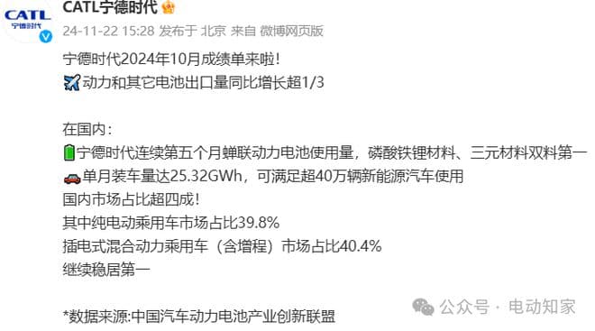 电动知家消息,11月22日,宁德时代官方发布2024年10月成战报,动力和其它电池出口量同比增长超1/3,在国内,宁德时代连续第五个月蝉联动力电池使用量,磷酸铁锂材料、三元材料双料第一。单月装车量达25.32GWh,可满足超40万辆新能源汽车使用。国内市场占比超四成!其中纯电动乘用车市场占比39.8%插电式混合动力乘用车(含增程)市场占比40.4%,继续稳居第一。
