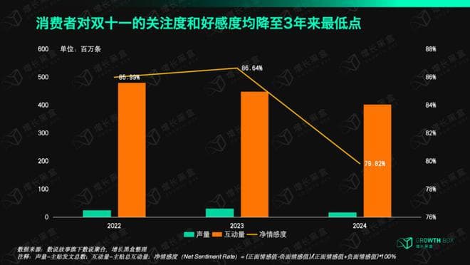 但我们发现, 2024年双11期间,社媒平台上关于双11的声量、互动量均低于2022、2023年,达到近3年来最低。不仅关注度变少了, 今年消费者对双11的好感度也降至3年来最低。反映在消费行为上则是,近几年 主流电商平台、头部消费品牌的双11GMV增速已经明显放缓。