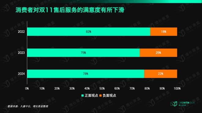 更重要的是,近三年,消费者对预售定金机制的满意度呈显著下滑态势,消费者关于双11定金机制的正负观点比例从2022年的72:28跌至2024年的59:41。