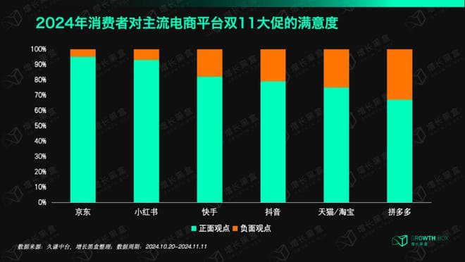 于是,我们研究了目前主流电商平台,发现2024年双11消费者满意度排名分别是:京东、小红书、快手、抖音、天猫/淘宝、拼多多。