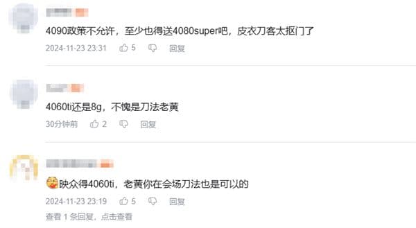 不过,有网友看后表示:"4060Ti还是8G,不愧是刀法老黄""映众的4060Ti,老黄你在会场刀法也是可以的""4090政策不允许,至少也得送4080super吧""应该送最好的,你也不缺这钱"等等。