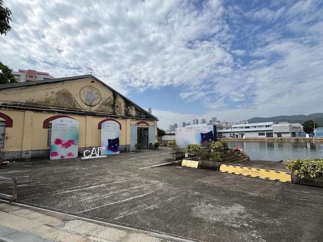 在澳门半岛的老城区,沿妈阁街向前走去,便走到了展览所在地——海事工房1号。这里是一栋老建筑,有一百三十余年历史,见证过澳门造船业的进程,至今保留了工业遗产的痕迹。现在,该场所历经改造,厂房外留有一池水,厂房内则变为了展示空间,成为当代艺术中心,向公众定期展现前沿艺术。