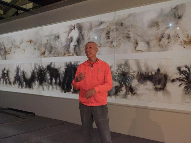 蔡国强在一黑一白的长卷作品前,赵梦佳摄,蔡工作室提供