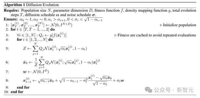 作者最终从数学上推导出了一种称为Diffusion Evolution的新算法,基于迭代误差校正来进行优化,类似于扩散模型,但不依赖于神经网络: