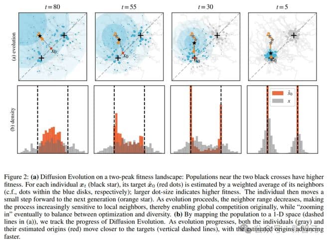 1)从一组随机解开始(如扩散模型中的噪声); 2)在每个步骤中,每个解决方案都由一个适应度函数评估,对每个解决方案进行「去噪」(与相邻解决方案加权平均来估计),并向前迈出一小步,同时加入一个小的随机突变; 3)逐渐减小相邻搜索半径(首先全局探索解决方案空间,然后在本地进行优化)